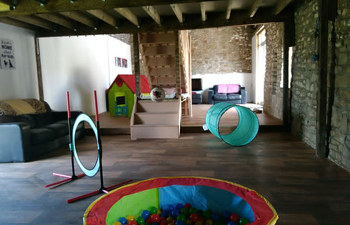 As well as our comfortable, spacious home we also are lucky enough to have a large open and secured yard, three enclosed lawns, one with permanent activities laid out, a play barn with easy chairs and sofas .... all for the dogs!